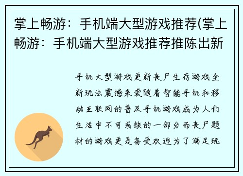 手游大型游戏下载第一步:选择适合自己的手游大作手游市场上存在着数以百计的大型游戏,因此,选择适合自己的游戏是非常重要的。首先,你需要了解自己的喜好和玩游戏的目的。是想寻求刺激?还是追求沉浸式的故事情节...
